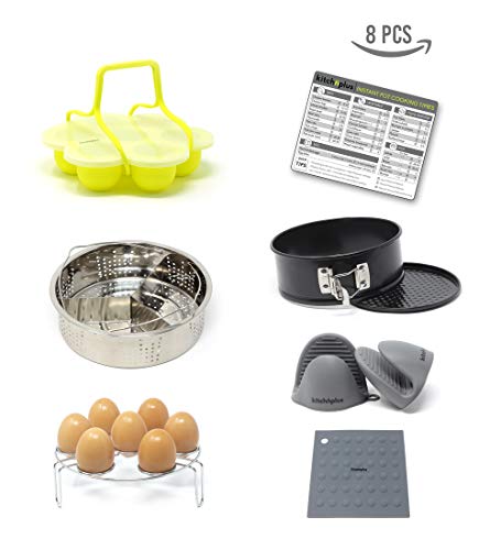 Instant Pot Accessories Set 8 pieces + Bonus Cooking Times Sheet By Kitchnplus – Fits Instant Pot 5,6 and 8 Qt – Premium Quality Products : Egg Bites Mold + Handle, Springform Pan, Steamer Basket + Divider, Egg Rack, Silicone Oven Mitts, Silicone Trivet Mat